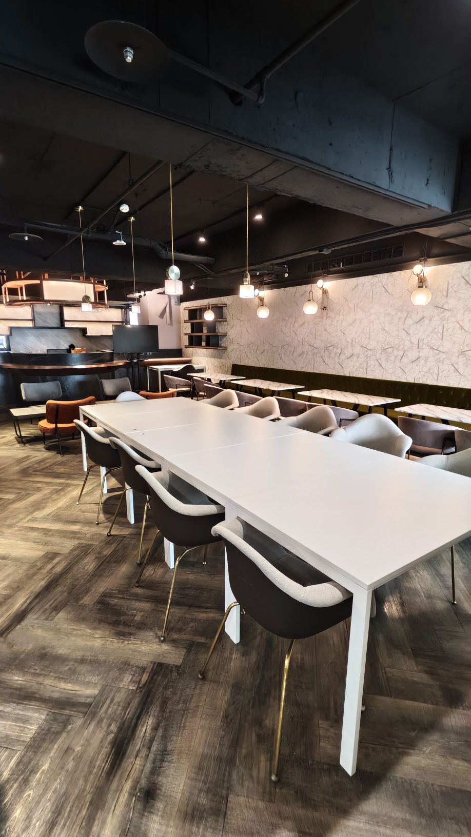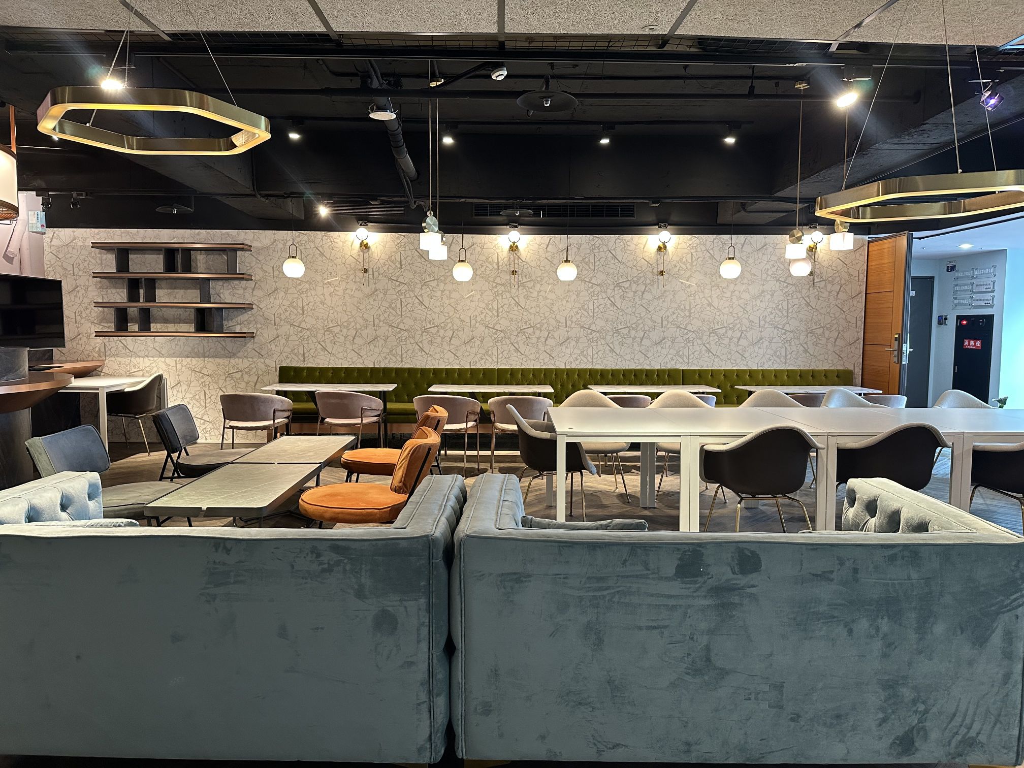位於台中西區台灣大道及五權路交叉口,鄰近台中車站、勤美誠品、中華路夜市等交通方便之地!共享咖啡廳場地跳脫傳統會議室的嚴肅,營造優雅的開放式商務沙龍氛圍,空間內點綴著暖調的球形藝術吊燈,搭配質感莫蘭迪綠絨面長椅與大理石紋路桌面。適合舉辦軟性的商務交流、創意工作坊或社交聚會。